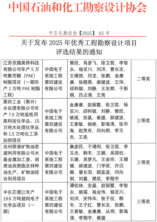 近期,中国石油和化工勘察设计协会在工程创新大会暨成立四十周年纪念活动上,正式公布了2025年度全国优秀工程勘察设计项目评选结果。根据协会发布的《关于2025年优秀工程勘察设计项目评选结果的通知》(中石化勘设协〔2025〕62号文),中电四公司四项参评项目全部入选,荣膺化工工程设计项目二等奖1项、三等奖3项,相关项目同时获评4项标杆工程并载誉登榜。