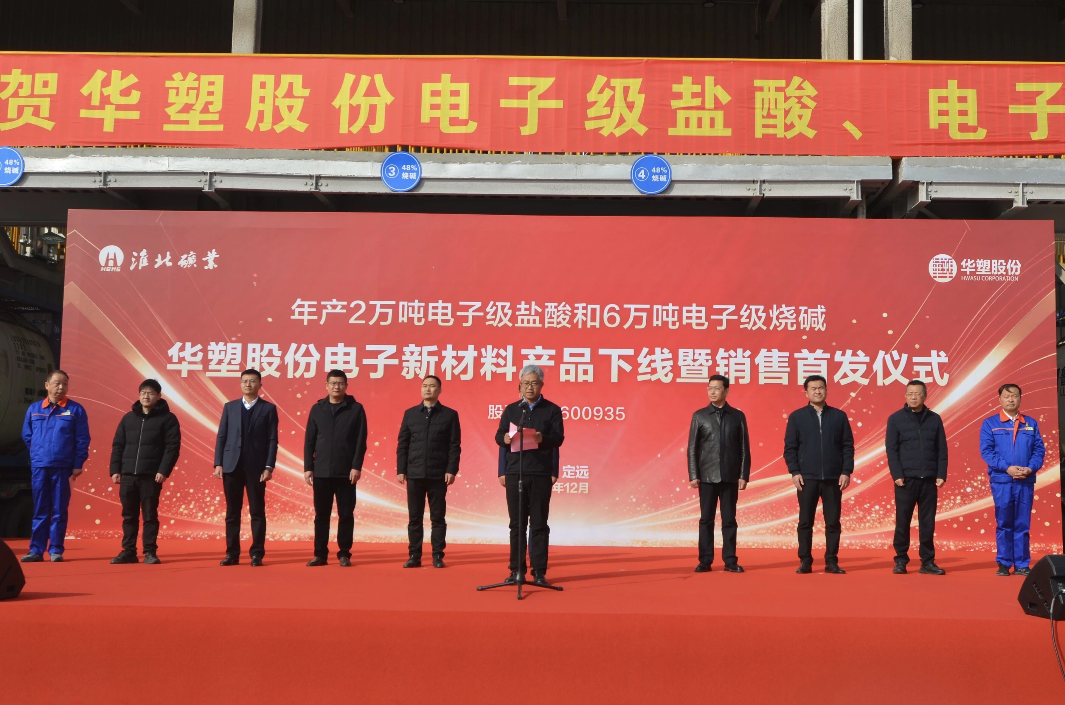 12月18日,华塑股份有限公司年产2万吨电子级盐酸、6万吨电子级烧碱新材料产品下线暨销售首发仪式在项目现场隆重举行。仪式上,首批高品质G3级电子级盐酸与G2级电子级烧碱成功下线并同步完成销售首发,实现了从产线贯通到市场交付的无缝衔接。定远县副县长,淮北矿业及安徽华塑相关领导、行业嘉宾、客户代表与参建单位共同出席。桑达股份高级副总裁、中电四公司党委书记、董事长王晓亮应邀出席并致辞,中电四公司化工总部总经理尚运雷,电子化学品及新材料事业部总经理王伟一同出席。