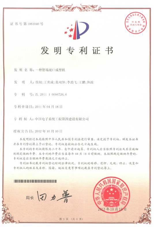 近期,公司喜获三项专利,其中“一种高大空间洁净室安装方法与结构”和“一种管端坡口成型机”为发明专利,“装饰墙板分体式圆弧转角”为实用新型专利。